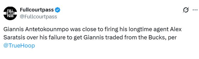 正因如此,当听到一则充满戏剧性的传闻时,才更让人震惊:字母哥险些解雇合作多年的经纪人亚历克斯-萨拉齐斯,原因是后者没能帮他实现离开雄鹿队的交易愿望。