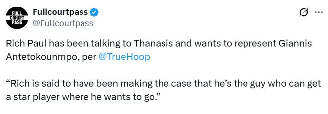 此外,对于经纪人而言,手握字母哥这样的客户意味着巨额的收益,因此圈内总会有消息称某位球星和其经纪人关系不和——这类流言往往会为其他经纪人创造介入的机会。