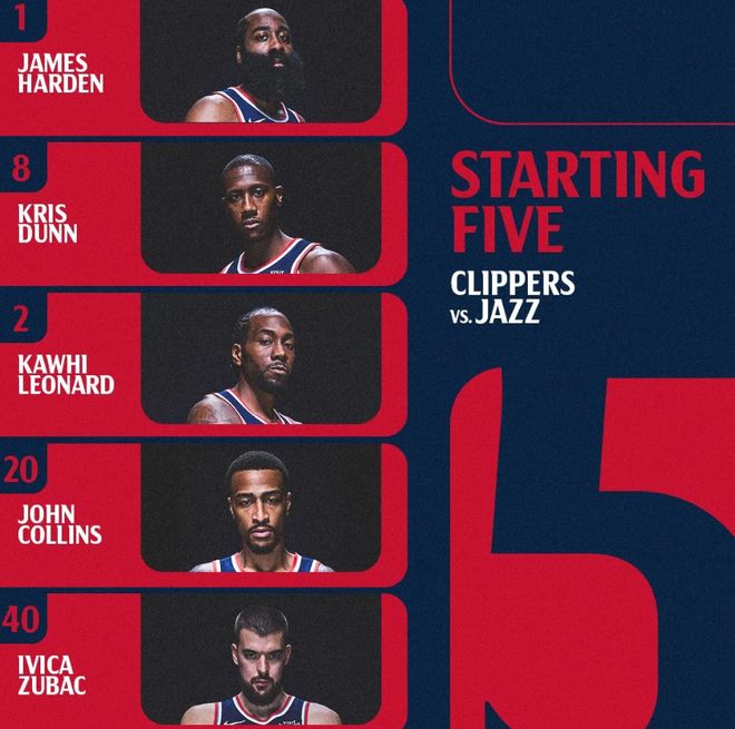 首发阵容方面,快船队这边, 比尔赛季报销,保罗继续未随队状态,克里斯-邓恩升级为可出战,教练排出的最新首发五人组为:詹姆斯-哈登、克里斯-邓恩、科怀-伦纳德、约翰-科林斯、伊维察-祖巴茨;爵士队这边,基扬特-乔治轮休、努尔基奇(连续三场拿到三双,创造了爵士队史纪录)生病缺席、马尔卡宁复出,首发阵容则为:以赛亚-科利尔、埃斯-贝利、科迪-威廉姆斯、劳里-马尔卡宁、凯文-乐福。