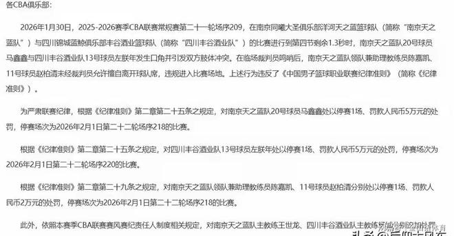 刚刚,CBA公司开出罚单,根据《纪律准则》第二章第二十五条之规定,对南京同曦马鑫鑫处以停赛1场、罚款人民币5万元的处罚;对南京同曦领队兼助理教练员陈嘉凯、11号球员赵柏清分别处以停赛1场、罚款人民币2万元的处罚;对南京同曦主教练王世龙,罚款1万处罚。