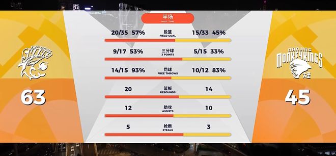 此后的比赛,南京队的进攻失误连连,大鲨鱼则稳扎稳打,刘礼嘉内线得手,张镇麟弧顶三分命中!半场比赛结束,上海久事男篮在主场63-45领先对手18分进入更衣室。