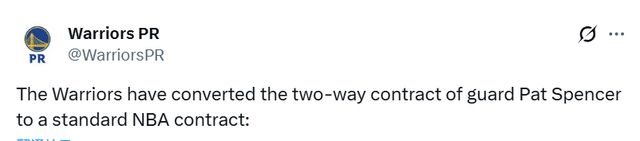 勇士在交易截止日后,阵容原本有两个正式名额空缺。在将斯宾塞合同转正后,球队目前还剩一个正式名额以及一个双向合同名额。