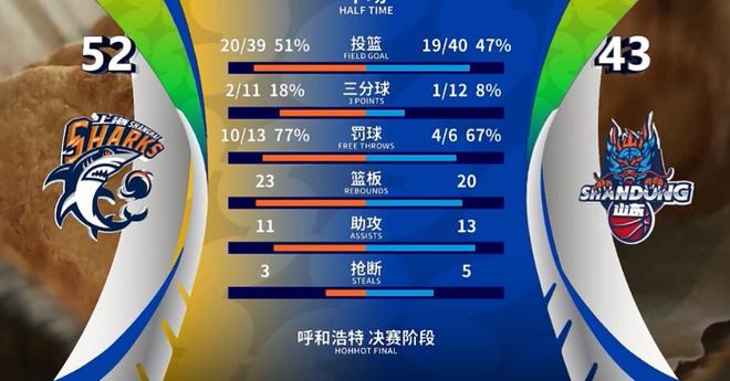 山东半场三分12中1,替补席仅得2分,简单来说,白边+洛夫顿在场,上海全面占优,白边不在,上海山东场面上五五开(陈林坚的开局2犯,第二节1秒没打,对山东影响也很大)。