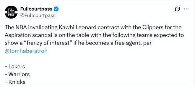 北京时间2月24日,据NBA记者汤姆-哈伯斯特罗报道,因此前涉及的阴阳合同问题,NBA有可能会宣布莱昂纳德与快船的合同无效。一旦莱昂纳德成为自由球员,预计湖人、勇士、尼克斯等球队会疯狂追求他。哈伯斯特罗在节目上的报道如下——