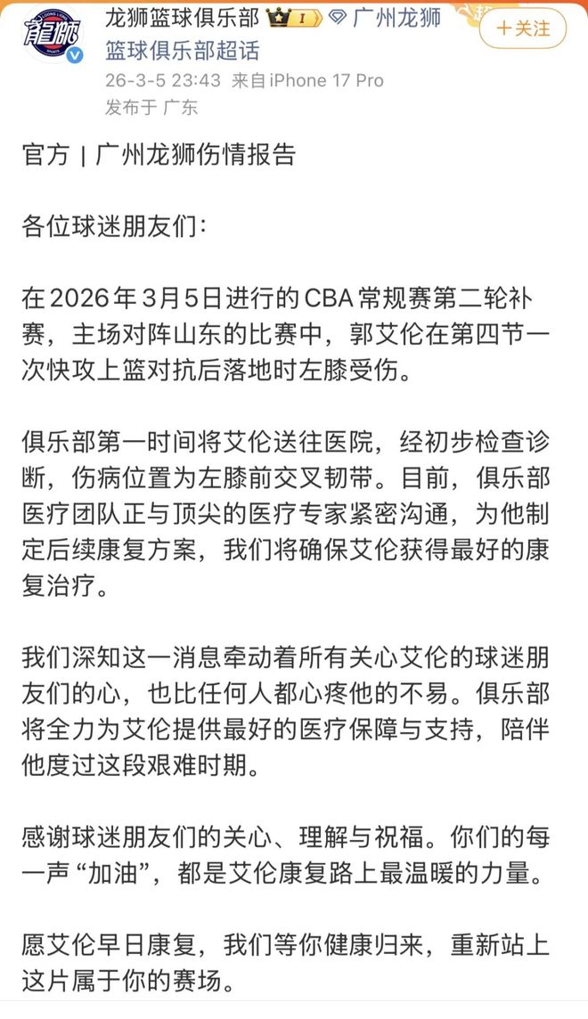 赛后,俱乐部也就郭艾伦的伤情发表官方公告,文中说到: 俱乐部第一时间将艾伦送往医院,经初步检查诊断,伤病位置为 左膝前交叉韧带 。 目前,俱乐部医疗团队正与顶尖的医疗专家紧密沟通,为他制定后续康复方案,我们将确保艾伦获得最好的康复治疗。