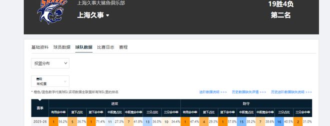 限制对手命中率为47.4%,而数据联盟平均水平是52.8%,他们低于平均水平5.4个百分点。除此之外,上海男篮限制对手三分命中率暂居联盟第二,限制对手篮协命中率暂居联盟榜首。