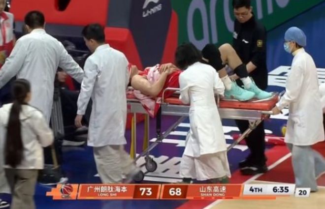 不过,广州队虽然是拿下了一场关键的比赛胜利,但是,却遭到了一个重大的打击,球队主力后卫郭艾伦,在比赛中受到了重伤。在第四节比赛,还有6分33秒的时候,郭艾伦想要冲击篮下得分,然而,他准备上篮的时候,与山东队球员谢智杰有一个身体对抗,随后郭艾伦就应声倒地,接下来,大家也是看到了,郭艾伦躺在地上,显得十分痛苦,随后,就被担架抬出,送往医院进行检查和治疗。