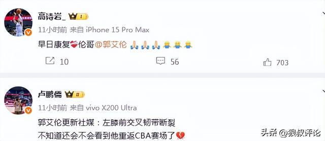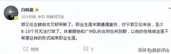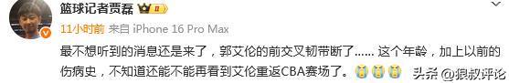 郭艾伦个人社媒更新伤情:“在医院出来了,前交叉韧带断了,今天知道了电视里演的有的不对,人在最难过绝望的时候不是一直哭,哭完是会笑的。”