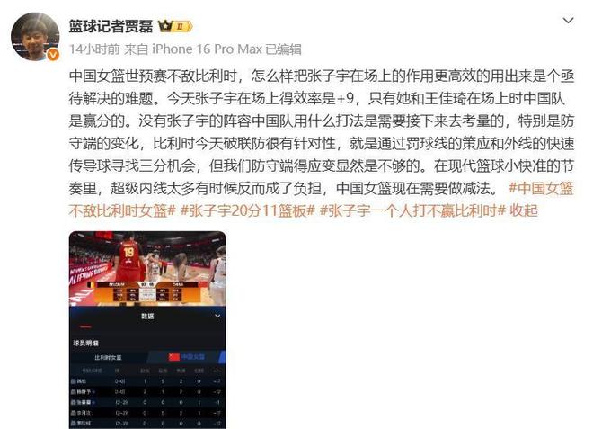 京媒则聚焦于内线表现失常,直言韩旭与李月汝作为国内最具统治力的两名内线,此役却集体迷失:韩旭全场11投3中仅得7分,李月汝7次出手仅2球命中,合计13分,面对比利时平均身高1米93、机动性极强的内线群,完全未能兑现预期压制力。