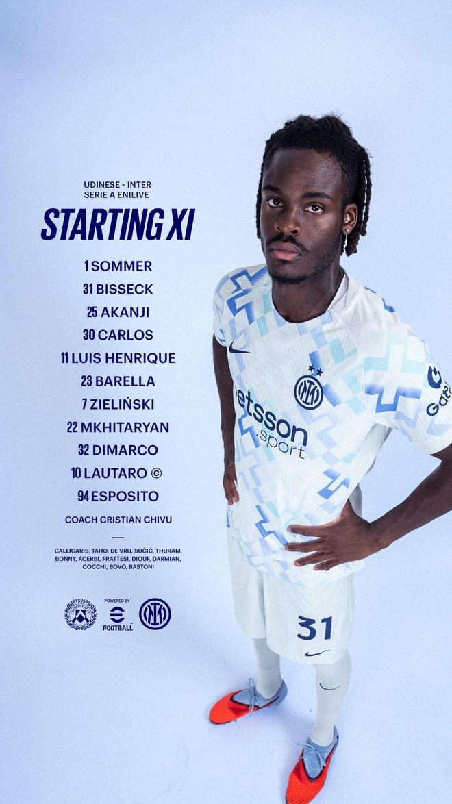 国际米兰首发:1-索默、7-泽林斯基、10-劳塔罗-马丁内斯、11-路易斯-恩里克、22-姆希塔良、23-巴雷拉、25-阿坎吉、30-卡洛斯-奥古斯托、31-比塞克、32-迪马尔科、94-皮奥-埃斯波西托
