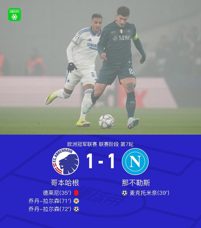 北京时间1月21日欧洲冠军联赛 联赛阶段 第7轮,哥本哈根对阵那不勒斯。哥本哈根乔丹-拉尔森破门。那不勒斯麦克托米奈破门。最终比分哥本哈根 1-1 那不勒斯。