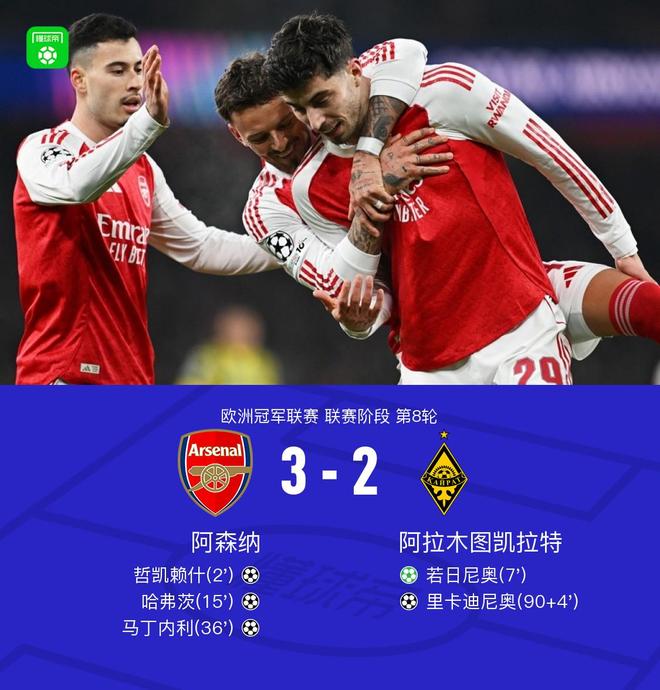 北京时间1月29日欧洲冠军联赛 联赛阶段 第8轮,阿森纳对阵阿拉木图凯拉特。阿森纳哲凯赖什破门,哈弗茨破门,马丁内利破门。阿拉木图凯拉特若日尼奥破门,里卡迪尼奥破门。最终比分阿森纳 3-2 阿拉木图凯拉特。