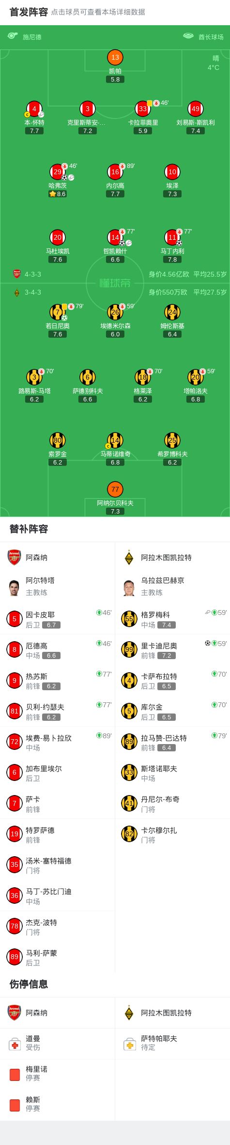 第46分钟,阿森纳半场换人,厄德高、因卡皮耶上场