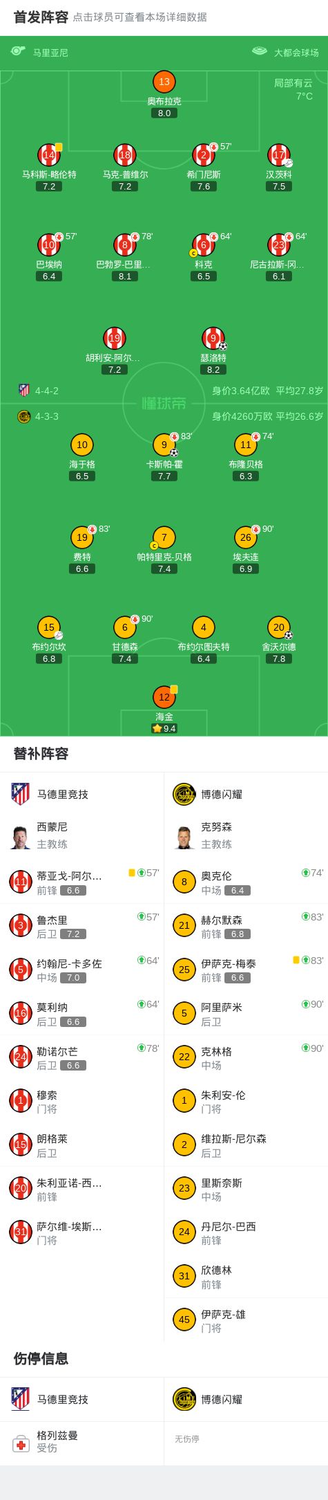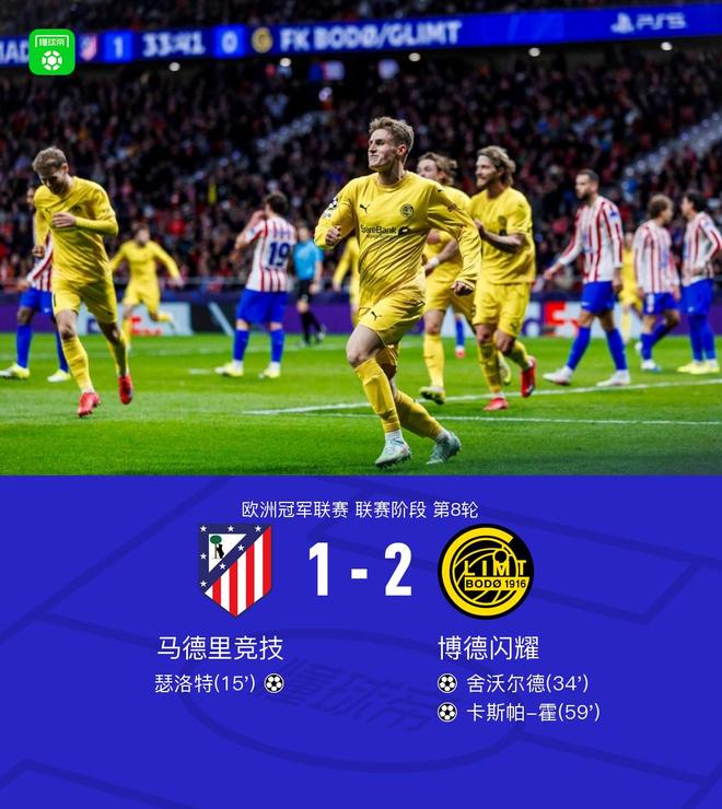 北京时间1月29日欧洲冠军联赛 联赛阶段 第8轮,马德里竞技对阵博德闪耀。上半场巴埃纳越位在先,头球破门被吹无效,之后汉茨科送出助攻,瑟洛特抢点头球破门先拔头筹,布约尔坎助攻舍沃尔德破门将比分扳平。下半场卡斯帕-霍门前混战中抢射破门将比分逆转。随即全场战罢,最终比分马竞 1-2 博德闪耀。