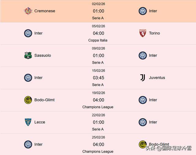 因为此后国米要对阵尤文,要去寒冷的挪威对阵博德闪耀,3月联赛里也将陆续对阵AC米兰、亚特兰大、罗马等队,如果欧冠晋级16强,届时赛程难度直线上升。