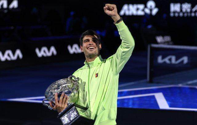 北京时间2月1日,在2026年澳网男单决赛中,头号种子阿尔卡拉斯面对十届赛会冠军德约科维奇,在2比6先丢一盘的情况下,以6比2、6比3和7比5,大比分3比1逆转取胜,职业生涯首夺澳网冠军。这不仅是阿尔卡拉斯的第七个大满贯赛冠军头衔,同时他也以22岁272天,成为了史上最年轻的男单“全满贯”得主。