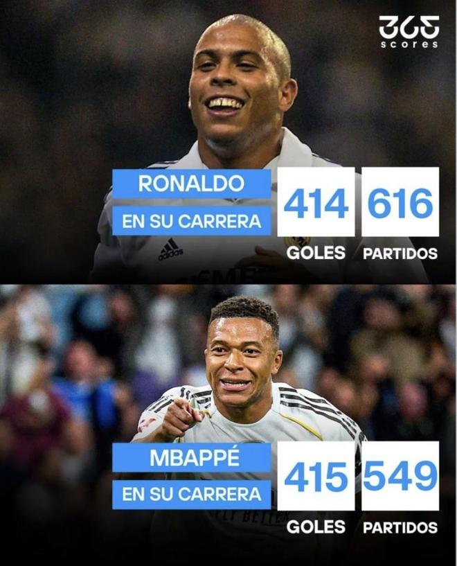 这场双响之后,365Scores给出的对比数字很直接:罗纳尔多(外星人)生涯616场414球,姆巴佩生涯549场415球。也就是说,姆巴佩在少踢将近70场的情况下,把外星人的生涯总进球追平并反超。