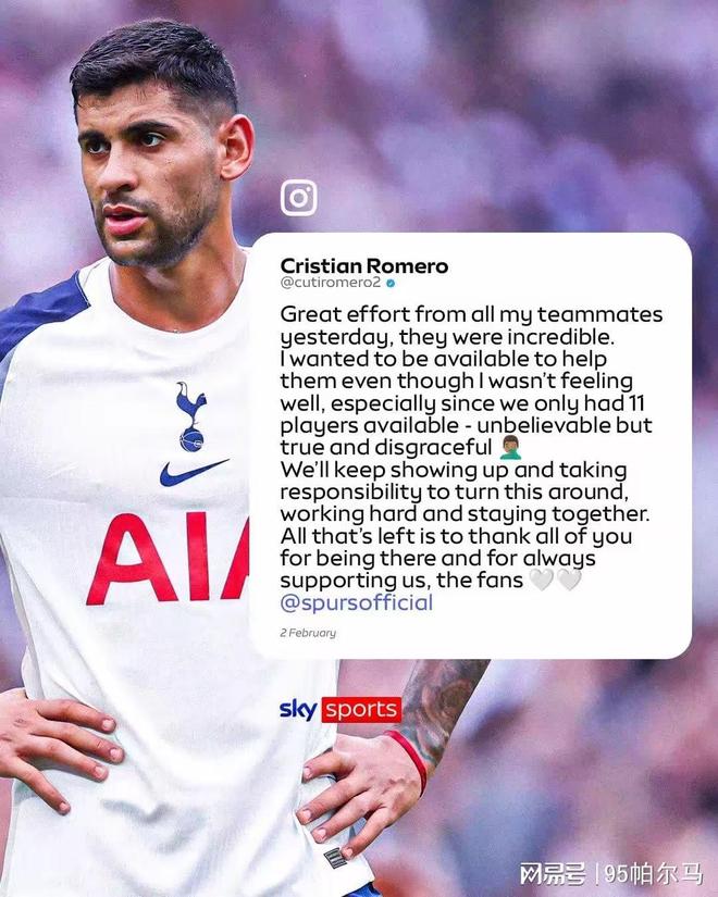 近期逼平曼城并不足以制造以下犯上的喜悦感,事实上热刺主帅弗兰克已经自我批评过:“我们的进攻不够流畅”。然而真正的“炮火”来自内部,罗梅罗在社交平台上就发泄了情绪:“我们全队只有11个人能踢球,这听起来匪夷所思,然而这是事实,也是耻辱。”