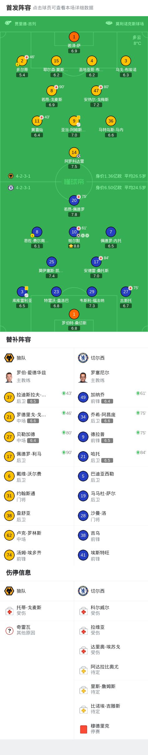 第54分钟,扳回一城,阿罗科达雷转身破门,狼队1-3切尔西