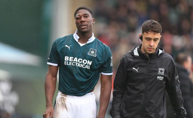 在英甲第31轮普利茅斯对阵林肯城的比赛中,普利茅斯前锋佩普尔眼睛被撞肿到睁不开。