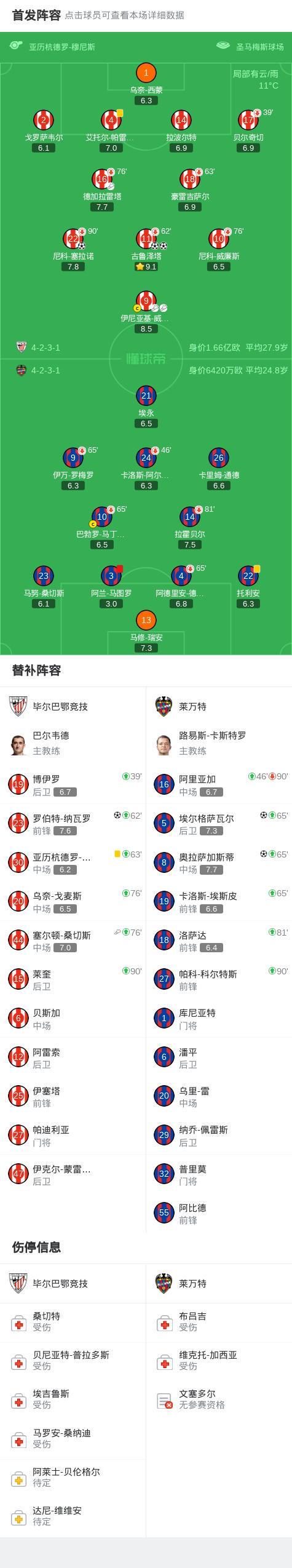 北京时间2月8日西班牙足球甲级联赛 联赛 第23轮,毕尔巴鄂竞技主场对阵莱万特。毕尔巴鄂竞技古鲁泽塔梅开二度,尼科-塞拉诺破门,罗伯特-纳瓦罗破门。莱万特埃尔格萨瓦尔破门,奥拉萨加斯蒂破门。最终比分毕尔巴鄂竞技 4-2 莱万特。