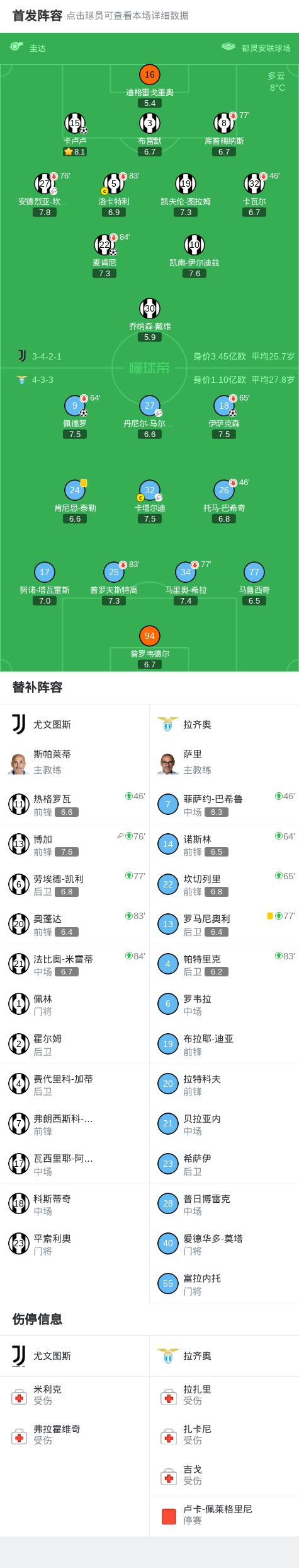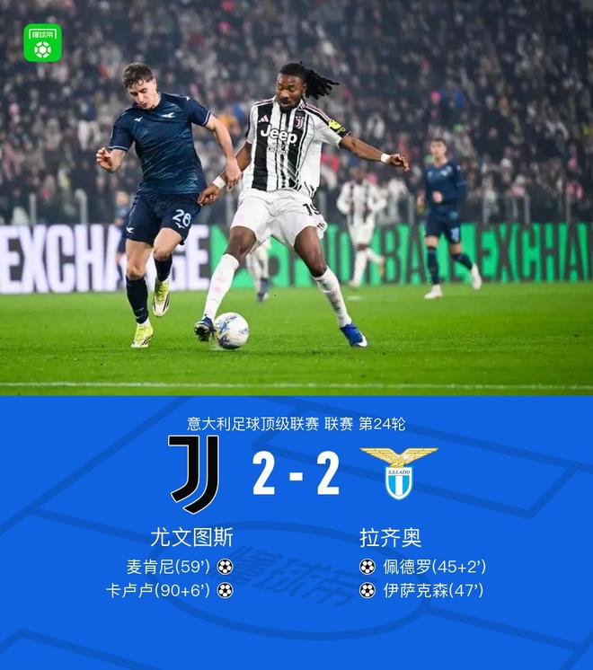 北京时间2月9日意大利足球顶级联赛第24轮,尤文图斯主场对阵拉齐奥。 上半场佩德罗抽射变线破门,库普梅纳斯破门被吹,下半场伊萨克森扩大比分,麦肯尼扳回一球,卡卢卢绝平比分。最终尤文图斯与拉齐奥战成2-2平。