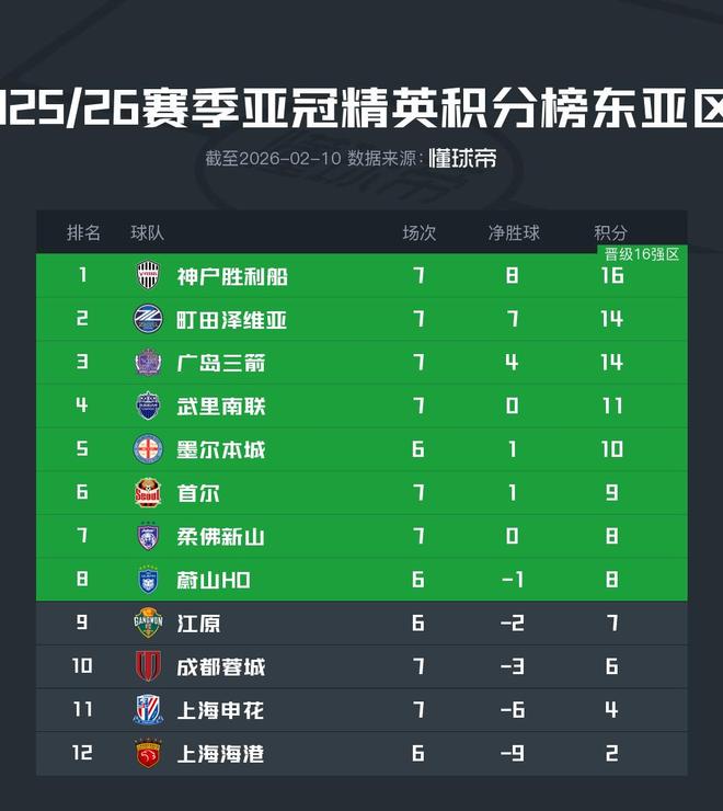 上海申花7轮4分提前出局;成都蓉城仍积6分,身前首尔9分(7轮)、柔佛8分(7轮)、蔚山8分(6轮)、江原7分(6轮),成都必须下轮客场击败町田泽维亚,且成绩超越四队里的任意两支。