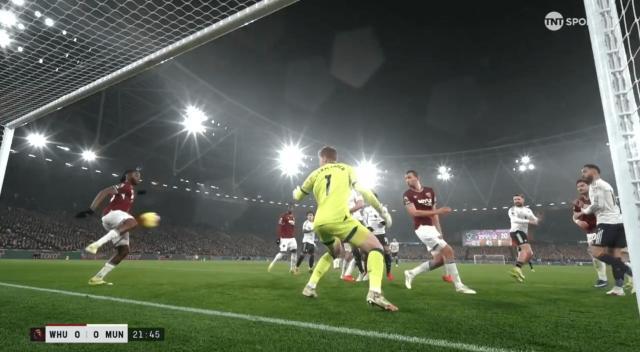 第22分钟,卢克·肖接B费低平角球横扫攻门,皮球被万-比萨卡在门线上用膝盖挡出。