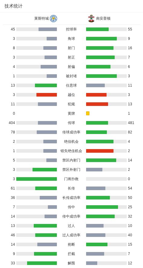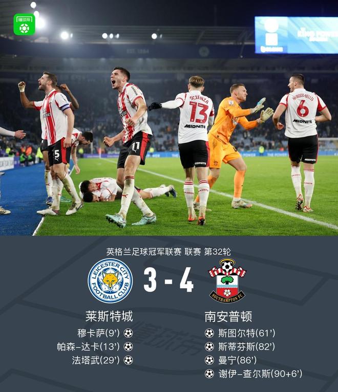 北京时间2月11日,英格兰足球冠军联赛第32轮,莱斯特城主场对阵南安普顿。比赛中,莱斯特城凭借穆卡萨、帕森-达卡和法塔武的进球取得3-0领先。此后场上风云突变,南安普顿依靠斯图尔特、斯蒂芬斯、曼宁和谢伊-查尔斯的进球让三追四神奇逆转。最终,南安普顿4-3莱斯特城。